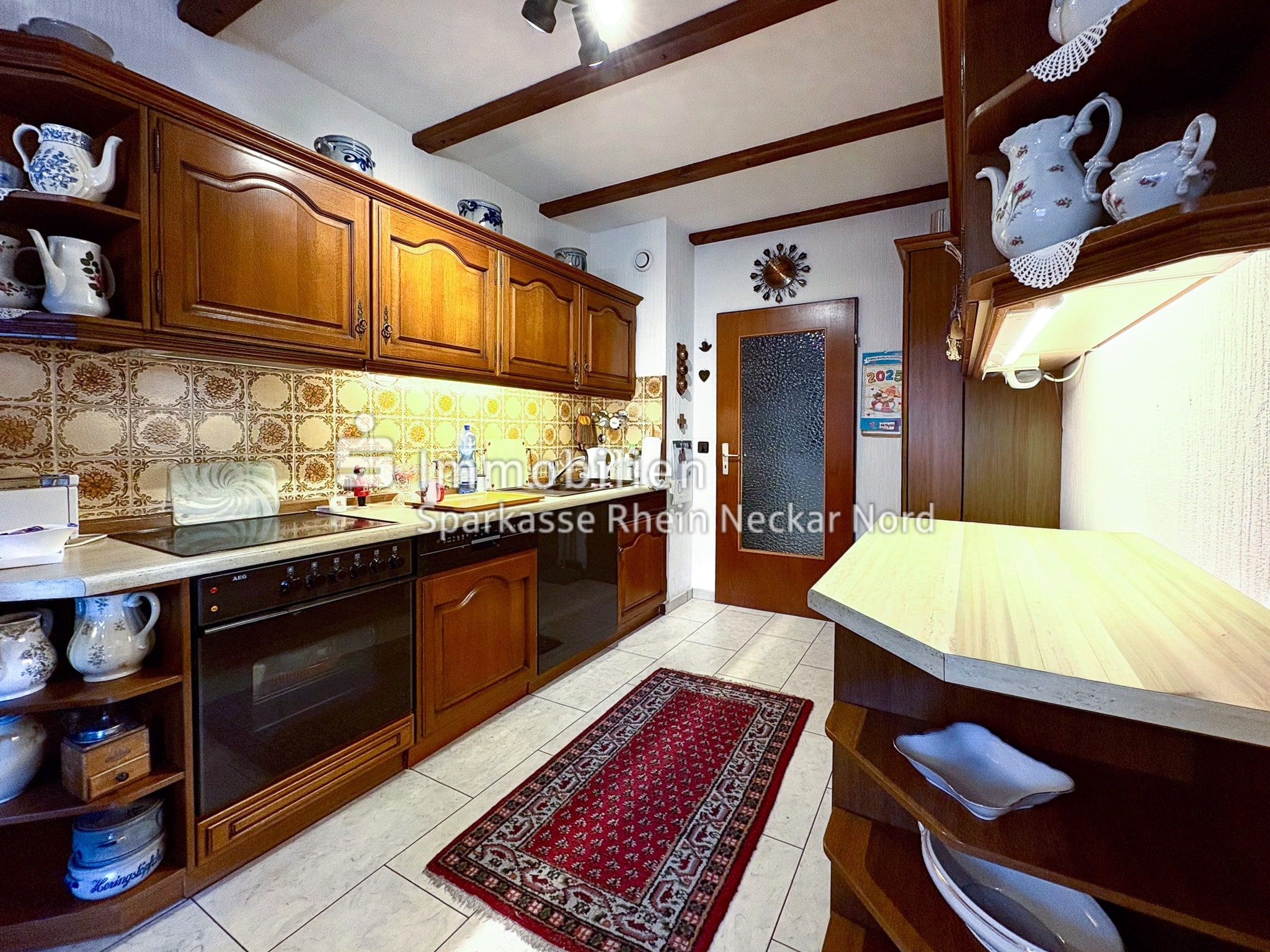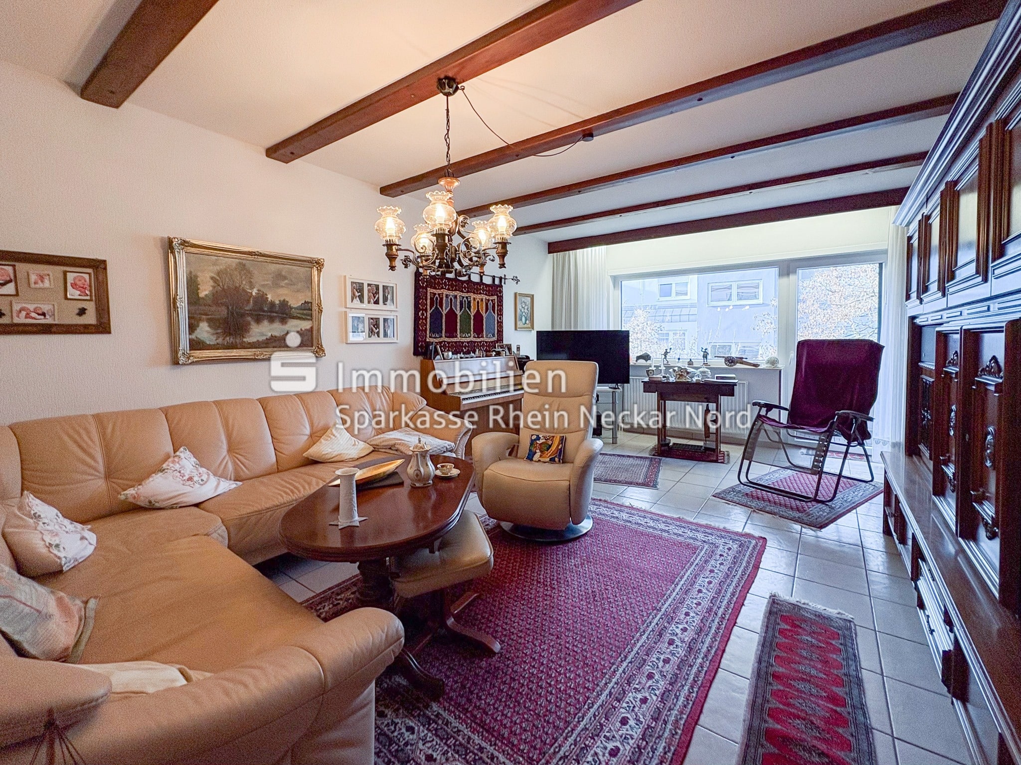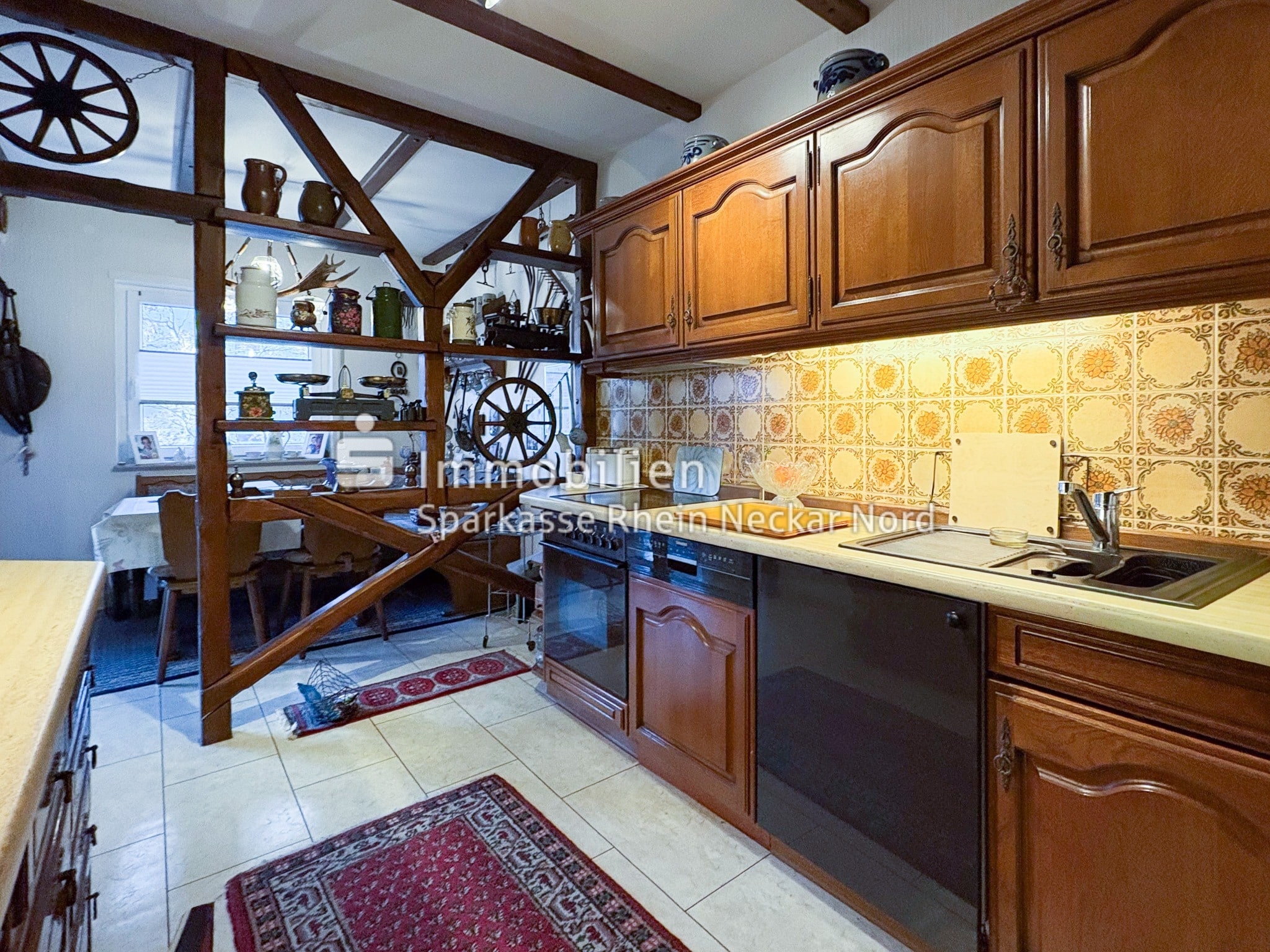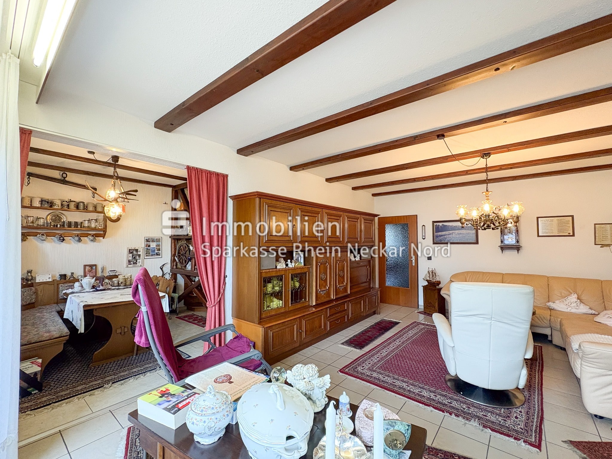 Der offen gestaltete Wohn- und Essbereich überzeugt durch eine klare Struktur und ein freundliches Ambiente. Die Küche ist durch eine hochwertige Holzvertäfelung optisch abgetrennt und fügt sich harmonisch in den Wohnbereich ein. Das großzügige Wohnzimmer bietet ausreichend Platz zum Entspannen und für individuelle Einrichtungsideen.