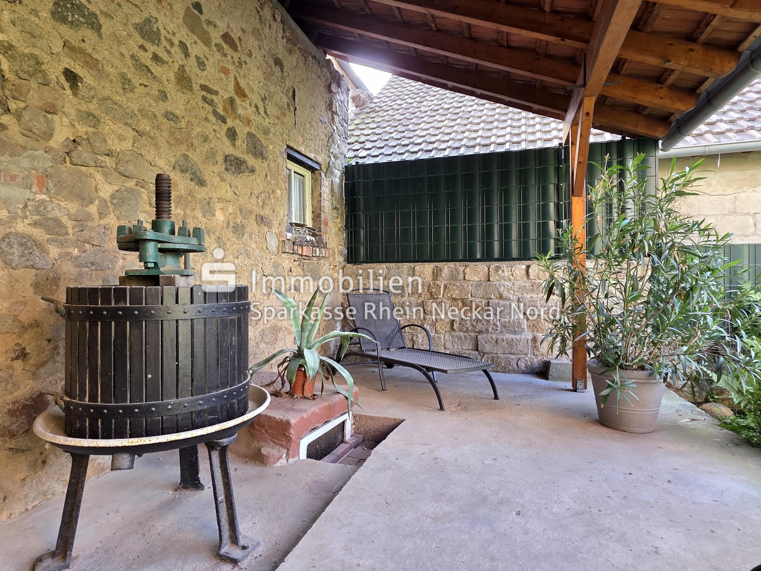 Es gibt zusätzlich ein gemauerter Schuppen mit überdachtem Sitzplatz, der als Hobbywerkstatt genutzt werden kann.