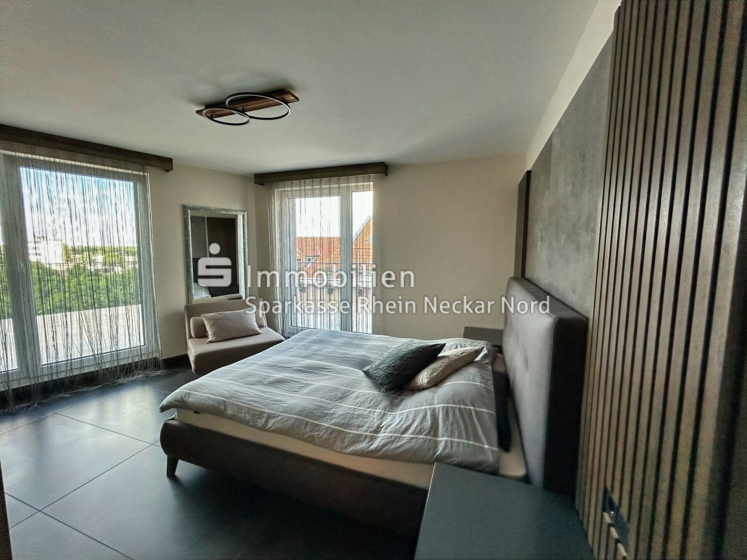Die Wohnung bietet insgesamt vier Zimmer – drei davon als Schlafzimmer nutzbar. Eines verfügt über direkten Zugang zu einem der beiden stilvoll ausgestatteten Bäder – ideal für Gäste oder als separater Elternbereich. Beide Badezimmer überzeugen mit bodengleichen Duschen, klaren Linien und hochwertigen Materialien.