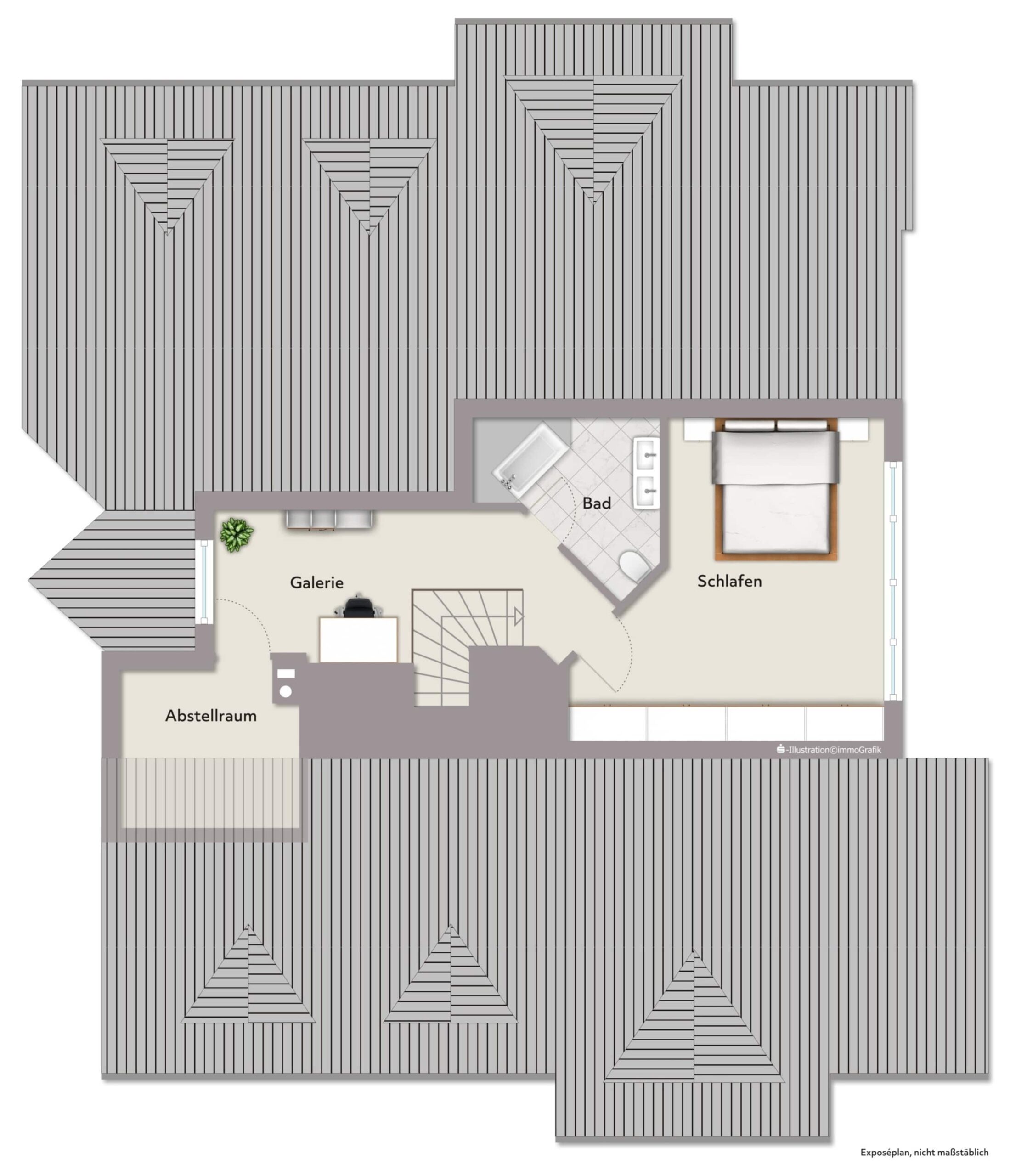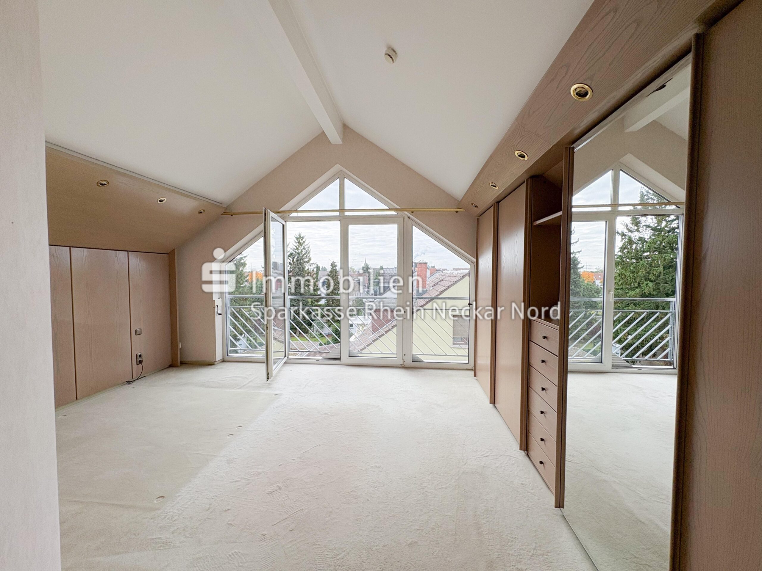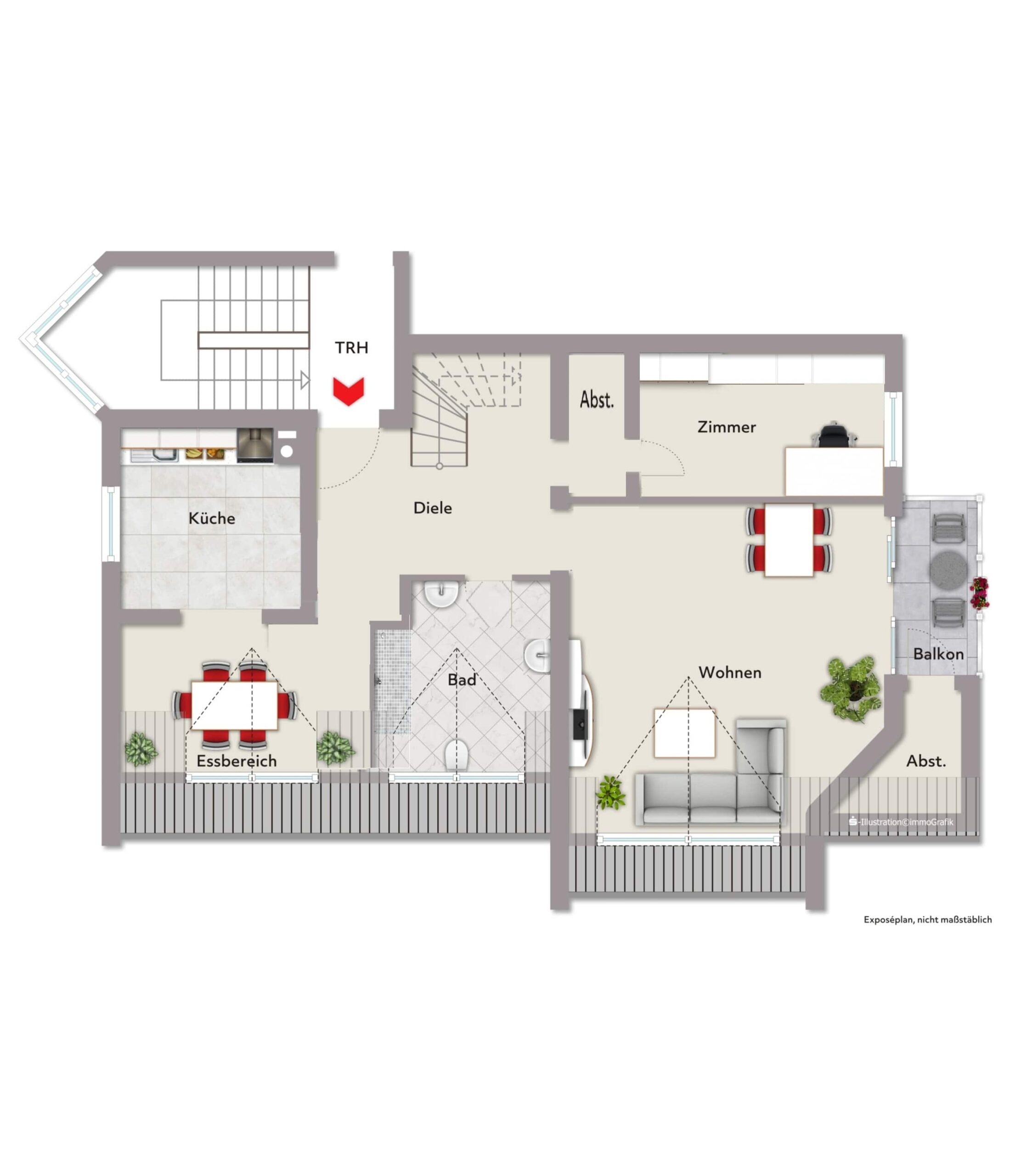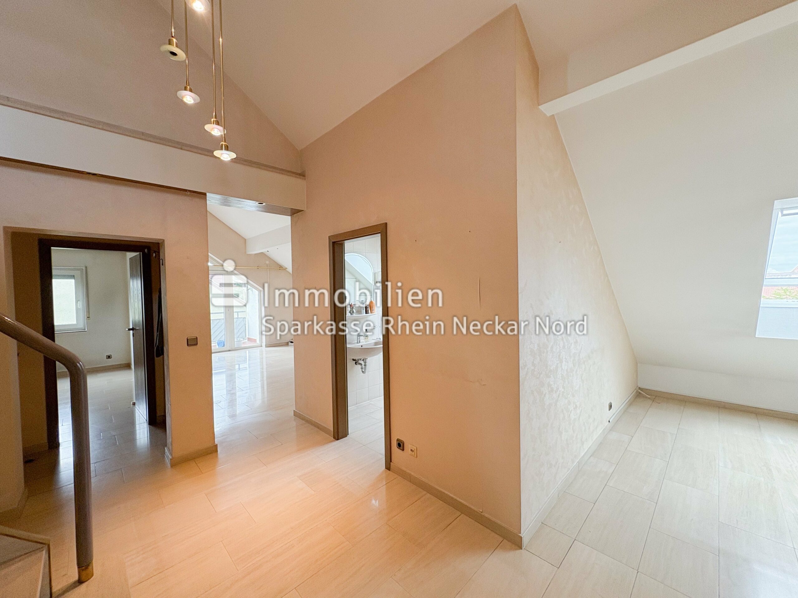 Der Wohnbereich mit Zugang zum Balkon schafft eine angenehme Wohnatmosphäre. Über eine innenliegende Treppe erreicht man die Galerieebene, die sich ideal als Arbeits- oder Gästebereich nutzen lässt.
